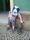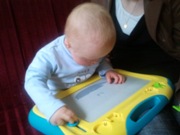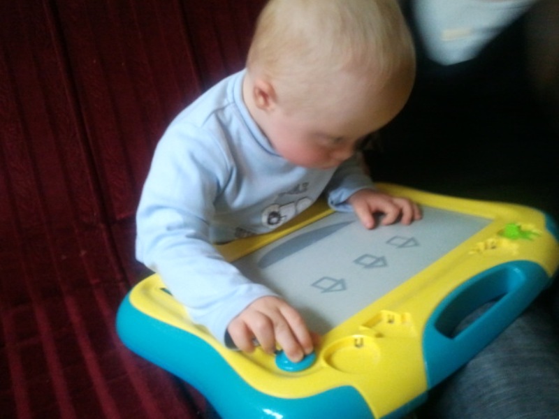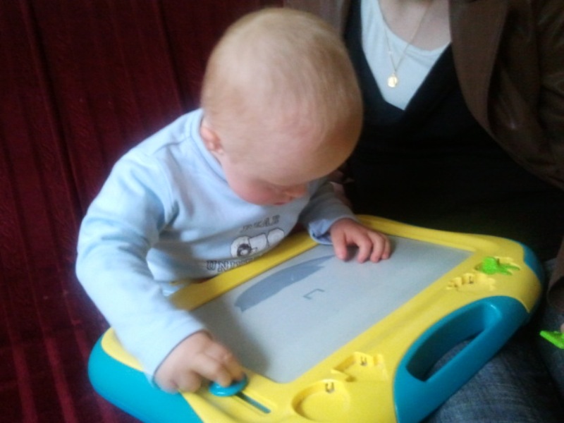 Kubuś z zabaweczką przed rehabilitacją - mamusia dzielnie rysuje :)