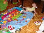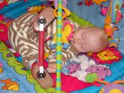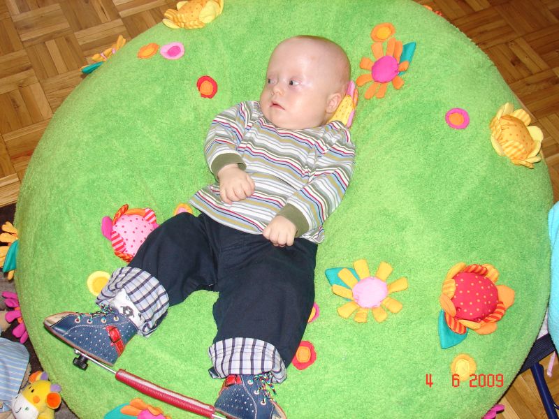 Kuba na macie edukacyjnej. Buciki z bliska, a Kuba śpi :) a nogi w górze :)